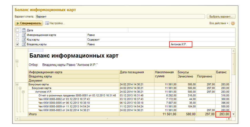 Этот отчет позволяет получать данные по текущему балансу информационных карт, а также информацию по накопленным суммам, доступен отбор по дате, информационной карте и владельце карты. В нашем отчете был установлен отбор по владельцу Антонову И.Р., и можно увидеть, что сумма доступных бонусов на сегодняшний день составляет 283 тг.