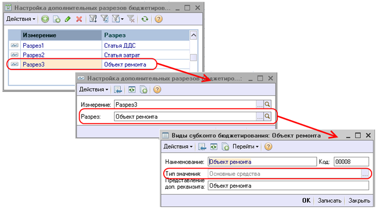 Рассмотрим принцип работы механизма на примере. Предположим, что на предприятии необходимо вести планирование затрат на ремонт в разрезе объектов ремонта. Для отражения этого дополнительного разреза необходимо произвести ряд действий по настройке программы.