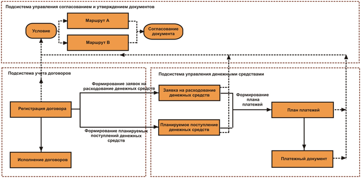 Подсистема учета договоров связана с другими подсистемами прикладного решения, в том числе с подсистемой «Казначейство». Суть взаимосвязи заключается в том, что на основании данных по условиям оплаты зарегистрированного в системе договора вводятся заявки на расходование денежных средств или документы планируемого поступления денежных средств.