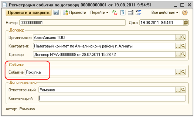 - регистрация различных событий по договорам (заключение договора, поступление или реализация по договору и прочие определяемые пользователем события);