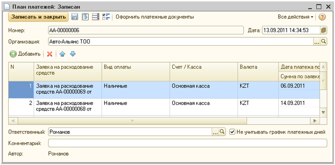 Итогом выполнения данной обработки будет готовый документ «План платежей».