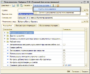 В верхней кнопочной панели формы в пункте меню «Настройка доступа» выбираем пункт «Группы пользователя».