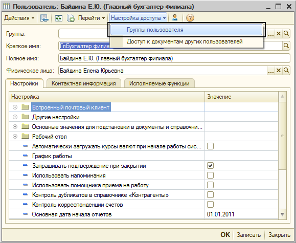 Настройка непосредственно прав доступа к отдельным элементам производится из справочника «Группы пользователей» при помощи обработки настройки прав доступа.
