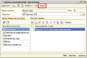 2-й способ. В форме группы пользователей (меню Сервис – Пользователи – Группы пользователей).