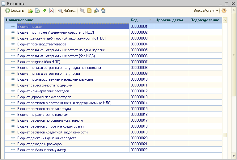 Список бюджетов определяется в справочнике «Бюджеты». Каждый элемент этого справочника определяет отдельный бюджет. Количество элементов данного справочника и перечень статей для каждого бюджета неограниченны.