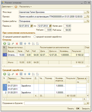 По результатам расчета можно получить печатную форму «Расчет среднего заработка», формируемую при нажатии на кнопку «Печать» на нижней панели формы обработки.