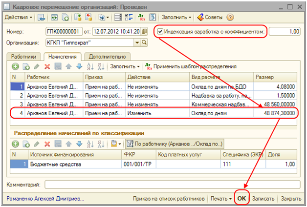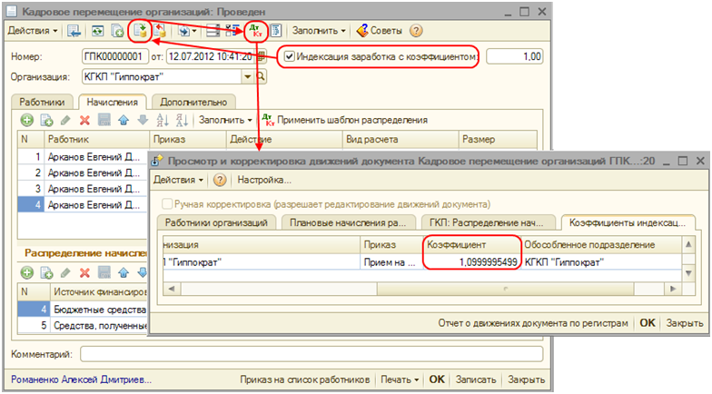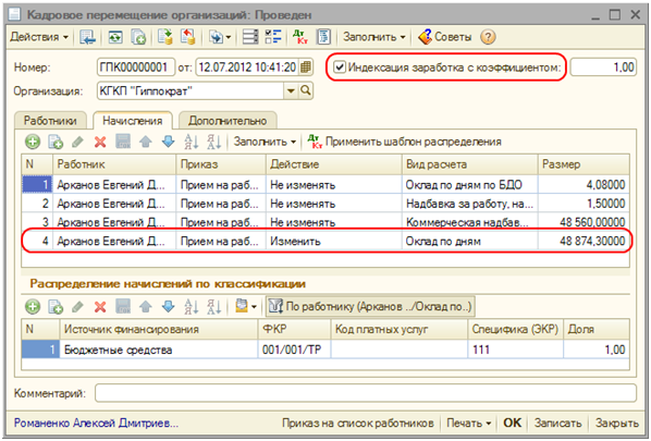 Непосредственно расчет коэффициента индексации заработка происходит при проведении документа «Кадровое перемещение организаций» с установленным в шапке документа признаком «Индексация заработка с коэффициентом». При этом на закладке «Начисления» документа «Кадровое перемещение организаций» для сотрудника должен быть указан новый размер изменяемого начисления.