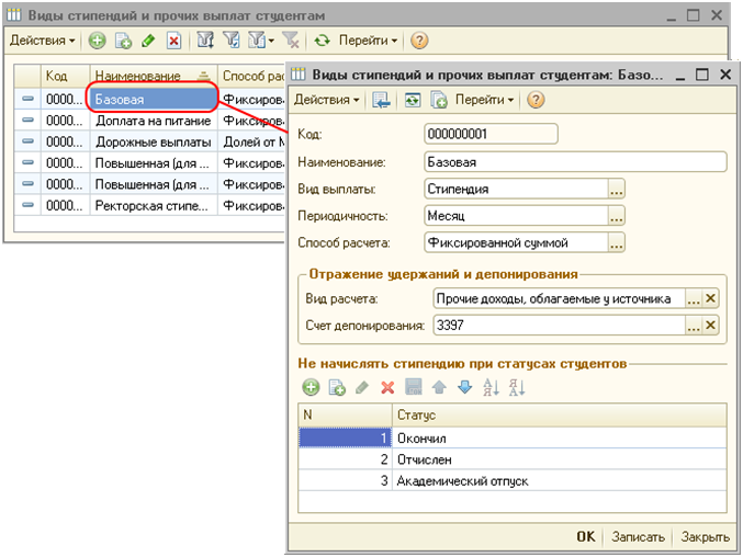 В справочнике необходимо заполнить наименование стипендии или выплаты, вид выплаты, периодичность начисления, а также можно указать состояния студента, при которых стипендия или выплата не должны начисляться.