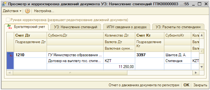 При отражении документа в бухгалтерском учете, регистрируется кредиторская задолженность перед контрагентами на счете, указанном в поле Счет расчетов с контрагентами (по кредиту проводки), в корреспонденции со счетом и аналитикой, указанными в группе Расходы (по дебету проводки), на сумму рассчитанной стипендии. В оперативном учете при проведении документа отражаются суммы к оплате в разрезе видов стипендий и учебных периодов.