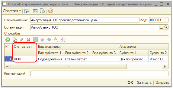 Для способа отражения расходов по амортизации должен быть указан счет отнесения затрат 8410.