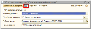 В открывшейся форме необходимо выбрать обработчик драйвера из списка доступных для сканера штрих-кодов и установить признак того, что устройство будет использоваться данным пользователем, кроме этого, необходимо указать рабочее место. Наименование элемента справочника будет заполнено системой автоматически. Для возможности настройки подключенного оборудования необходимо сохранить данный элемент справочника при помощи соответствующей кнопки панели инструментов справочника.