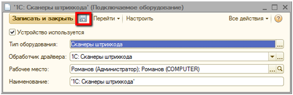 После этого необходимо сохранить указанные настройки и установленное оборудование в информационной базе при помощи кнопки «Записать и закрыть». На этом настройка сканера штрих-кодов окончена.