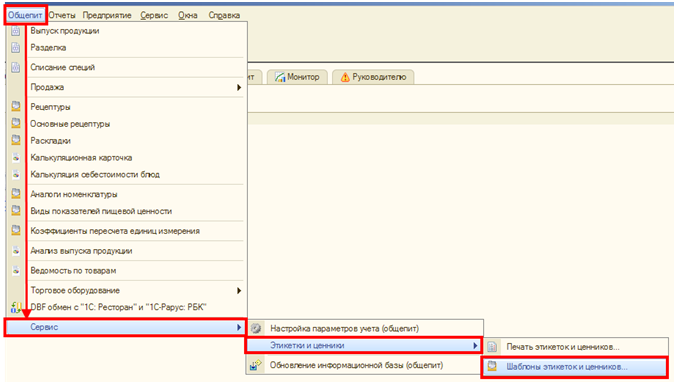 Далее рассмотрим, каким образом в информационной базе можно настроить шаблоны для этикеток и ценников товаров. Для этого необходимо воспользоваться меню «Общепит» — «Сервис» — «Этикетки и ценники» — Шаблоны этикеток и ценников».