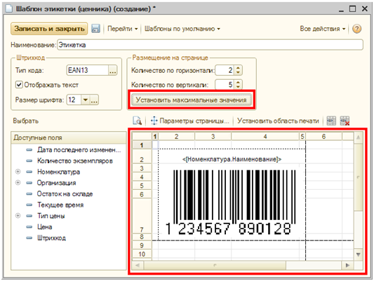 Теперь для расчета количества ценников заданного шаблона, помещающихся на листе по горизонтали и по вертикали, можно воспользоваться кнопкой «Установить максимальные значения». После этого необходимо сохранить созданный шаблон.