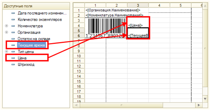 В оставшиеся ячейки добавляем поля «Цена» и «Текущее время»: