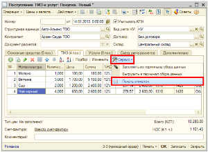 Так, в результате данных действий номенклатура «Молоко» добавится в табличную часть «ТМЗ» документа «Поступление ТМЗ и услуг», пользователю необходимо будет только ввести количество и цену.