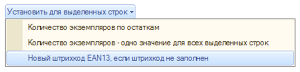 В командной панели выбираем пункт меню «Установить для выделенных строк» - «Новый штрих-код EAN13, если штрих-код не заполнен».