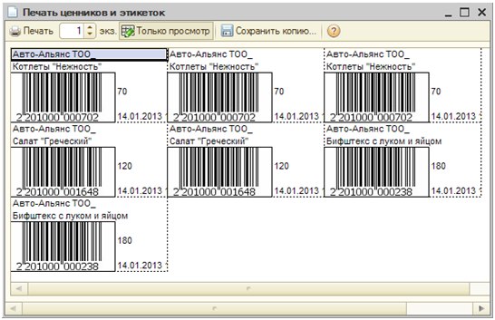 Появится окно предварительного просмотра сформированных по шаблону этикеток, при этом, количество этикеток для каждой номенклатуры будет равно количеству номенклатуры. Распечатанные этикетки необходимо будет наклеить на соответствующие товары.