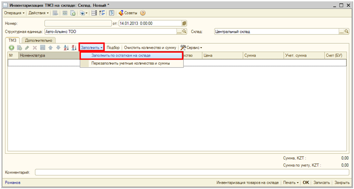 Рассмотрим проведение инвентаризации на складе с помощью терминала сбора данных. Сначала заполняем документ «Инвентаризация ТМЗ на складе» по остаткам.