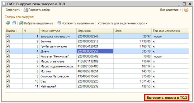 После заполнения сведений о штрих-кодах можно выгрузить данные о товарах в терминал сбора данных с помощью кнопки «Выгрузить товары в ТДС».