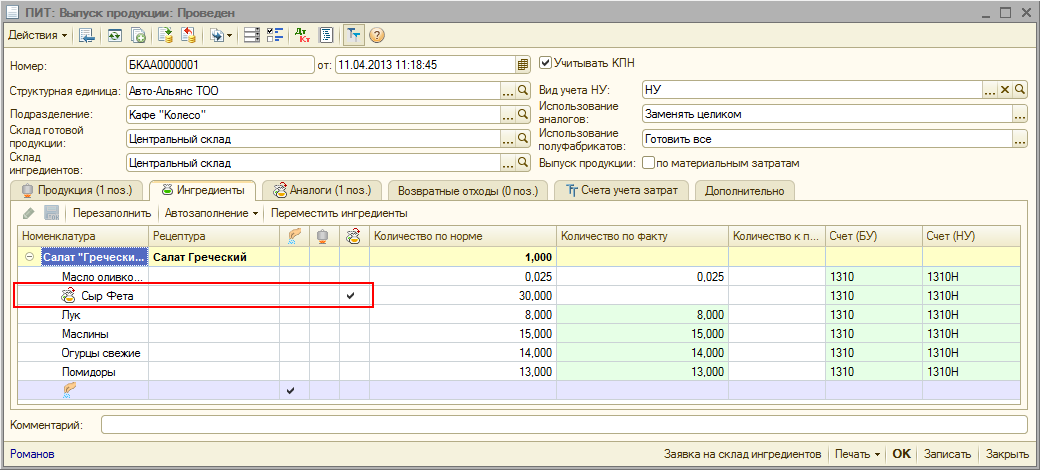 Здесь следует обратить внимание на то, что хотя в рецептуре приготовления блюда «Салат Греческий» указан ингредиент «Сыр Фета», документом списывается его аналог – ингредиент «Брынза».