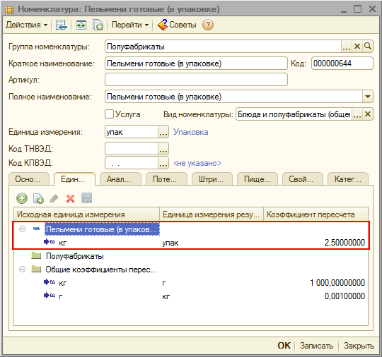 Чтобы значение коэффициента устанавливалось в табличную часть «Ингредиенты» автоматически, при выборе номенклатуры «Пельмени (готовые в упаковке)», можно один раз задать коэффициент пересчета для купленных пельменей из килограммов в упаковки. Для этого в карточке номенклатуры «Пельмени (готовые в упаковке)» на закладке «Единицы измерения» необходимо ввести исходную единицу измерения – килограмм, результирующую единицу измерения – упаковка и коэффициент пересчета равный 2,5.
