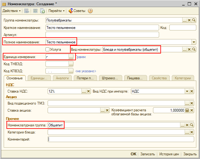 Для этого в справочнике «Номенклатура» создаем новый элемент «Тесто пельменное».