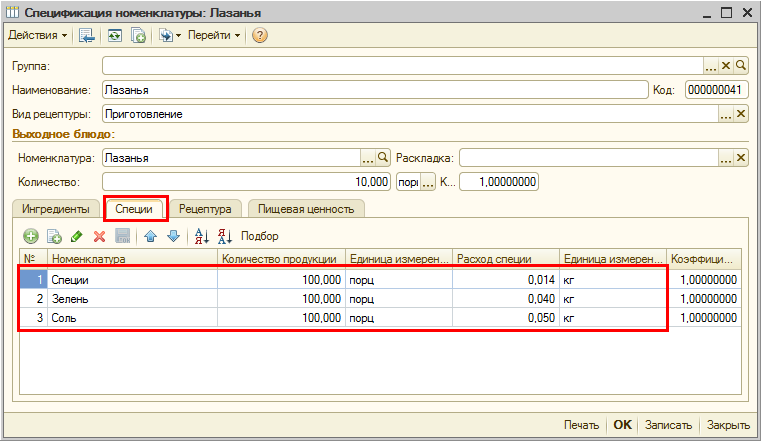 Дополнительно у рецептур приготовления есть еще три табличные части: «Специи», «Рецептуры» и «Пищевая ценность». При приготовлении нашего блюда «Лазанья» используются специи. Укажем их перечень в соответствующей табличной части.