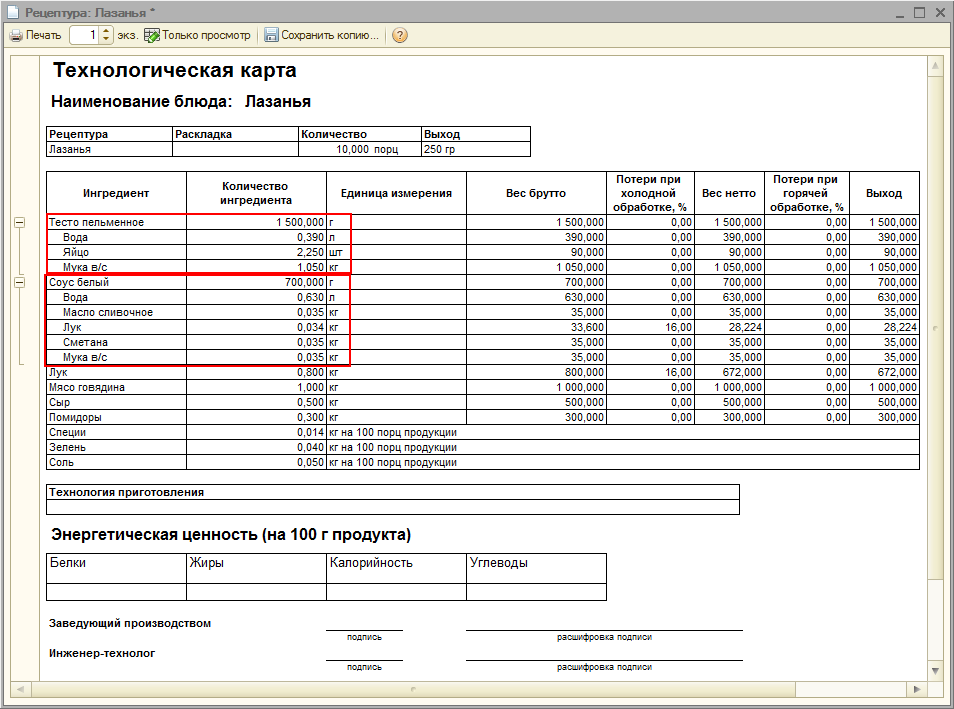 Нам необходимо создать рецептуру для блюда «Лазанья» на 10 порций, используя в рецептуре полуфабрикаты: тесто пельменное и белый соус. Кроме этого, необходимо сформировать технологическую и калькуляционную карточки.