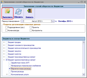 В списке «Бюджеты и статьи бюджетов» обработки выберем статью «Маркетинговые расходы» и нажмем кнопку «Выполнить». Табличная часть будет заполнена строками с выбранной статьей бюджета.