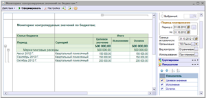 Анализ ситуации по тому, какие контролирующие параметры введены в систему, достигнуты ли целевые показатели, можно провести, сформировав отчет «Контролируемые значения по статьям оборотов». В отчет выводятся данные по: