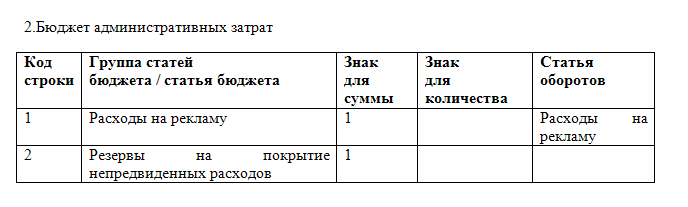 Рассмотрим построение структуры бюджета на примере формирования следующих бюджетов: бюджет продаж, бюджет административных затрат и бюджет доходов и расходов. Для каждого вида бюджета определим набор статей, в разрезе которых будет вестись планирование.