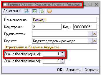Знак в балансе (для суммы и для количества) влияет на получение итогов по группам иерархии строк бюджета – каким образом (с каким знаком) обороты по статье учитываются в обороте по группам. Например, в рассматриваемом нами случае, обороты по статьям суммируются, поэтому для всех статей реквизит «Знак в балансе (сумма)» со значением «1», то есть положительный. Однако, для группы «Расходы» бюджета доходов и расходов данный реквизит указан со значением «-1». Это означает, что обороты по этой группе будут вычитаться при формировании итогов по данному бюджету.