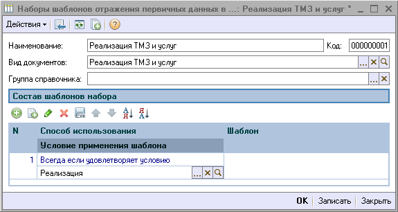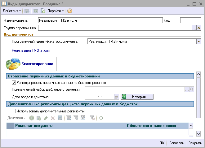 Применяемый набор шаблонов отражения выбирается из справочника «Наборы шаблонов отражения первичных данных в бюджетах» (меню «Учет фактических данных» - «Наборы шаблонов отражения первичных данных в бюджетах»). В списке выбора создадим новый элемент справочника, назовем его «Реализация ТМЗ и услуг» и укажем одноименный вид документов.