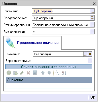 Табличная часть «Составные части условия» представляет собой список условий на данные документа, где каждая строка списка редактируется в отдельном окне. Добавим строку в табличную часть и в открывшемся окне установим значения, удовлетворяющие нашему условию.