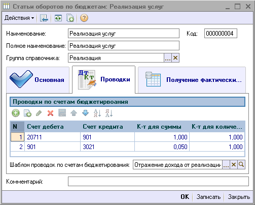 Статья оборотов будет иметь фиксированное значение «Реализация услуг», для данной статьи оборотов задан шаблон проводок по счетам бюджетирования «Отражение дохода от реализации». По этим счетам будут формироваться обороты при проведении документа «Реализация ТМЗ и услуг».