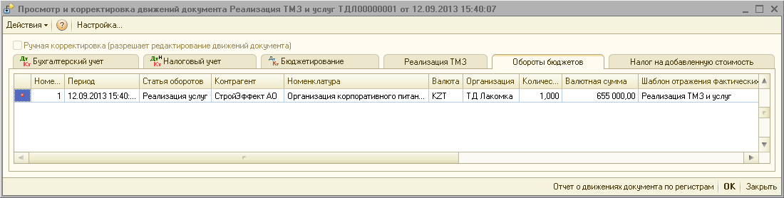 Проверим работу схемы отражения фактических данных. В августе 2013 года компанией была реализована услуга по организации корпоративного питания на сумму 655 000 тенге. Для отражения данной операции в конфигурации «1С-Рейтинг: Управление финансами и бюджетирование для Казахстана», создадим документ «Реализация ТМЗ и услуг». В табличной части «Услуги», укажем услугу «Организация корпоративного питания», количество 1, сумму 655 000 тенге, заполним все необходимые поля и проведем документ.