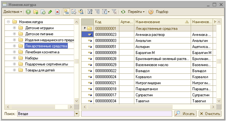 В прикладном решении «1С:Аптека для Казахстана» сведения о лекарственных средствах хранятся в справочнике «Номенклатура». Справочник является иерархическим, что позволяет группировать элементы справочника произвольным образом.