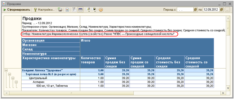Конфигурация позволяет хранить информацию о фасовках, дозировках и формах выпуска лекарственных средств. Данная информация хранится в характеристике лекарственного средства. Использование характеристик позволяет анализировать остатки, а также определять себестоимость лекарственных средств в разрезе характеристик, то есть фасовок, дозировок и форм выпуска.