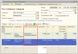 Для одной позиции номенклатуры может быть задано любое количество элементов справочника «Серии номенклатуры». При добавлении новой позиции номенклатуры в табличную часть документа, пользователь выбирает нужную серию для той номенклатуры, для которой установлен флаг ведения учета по сериям.