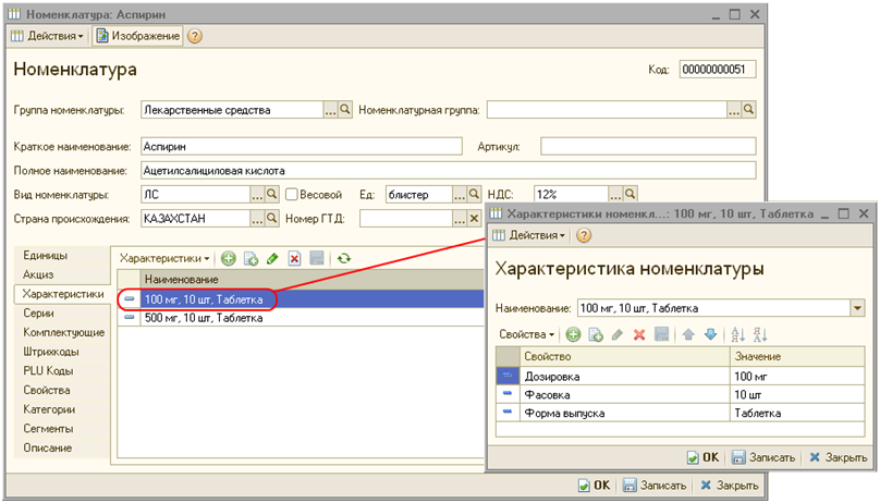 Например, аспирин поставляется в блистерах по 10 таблеток, но дозировка может равняться 100 мг. или 500 мг. Тогда необходимо создать две характеристики номенклатуры. В первой необходимо указать дозировку – 100 мг., фасовку – 10 шт., форму выпуска – «Таблетки». Во второй дозировку – 500 мг., фасовку – 10 шт., форму выпуска – «Таблетки». Таким образом, в системе был зарегистрирован аспирин с двумя видами дозировки, используя только один элемент справочника «Номенклатура». В дальнейшем, при регистрации поступления лекарственного средства, необходимо будет в поле «Характеристика» выбирать соответствующую характеристику.