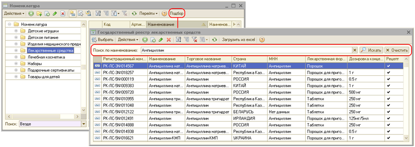 Для создания номенклатуры из реестра лекарственных средств необходимо воспользоваться кнопкой «Подбор» командной панели списка номенклатуры. В открывшемся регистре сведений можно осуществить поиск по наименованию лекарственного средства.
