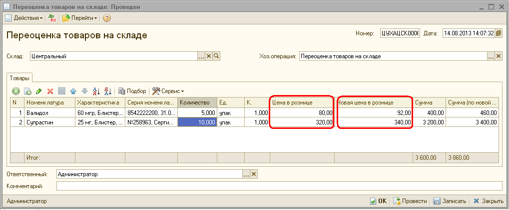Например, при проведении документа со склада спишется 1 упаковка Цианокобаламина по текущей цене, а приход произойдет в количестве 10 ампул по новой установленной цене.
