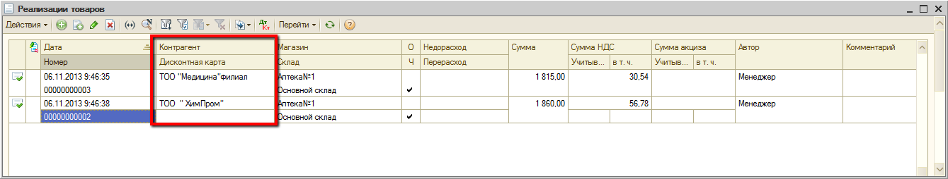 При нажатии на кнопку «Закрыть смену» происходит закрытие чеков и создание документов «Реализация товаров». Информация из чеков по бесплатным рецептам переносится в табличную часть документа «Реализация товаров». Система автоматически создаст несколько документов «Реализация товаров», при этом, для каждого контрагента будет создан отдельный документ, в который будут включены данные по всем чекам, оформленными по соответствующему контрагенту и виду оплаты.