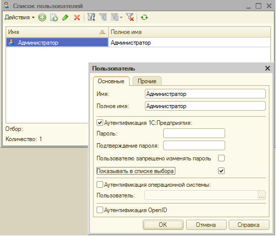 Для организации доступа пользователей к данным предназначена система ролей, которые определяют доступ к объектам конфигурации. После ввода информации о пользователе и его пароле перейдите на закладку «Прочие» и определите для пользователя роль «Администратор (полные права)» и интерфейс «Полный».