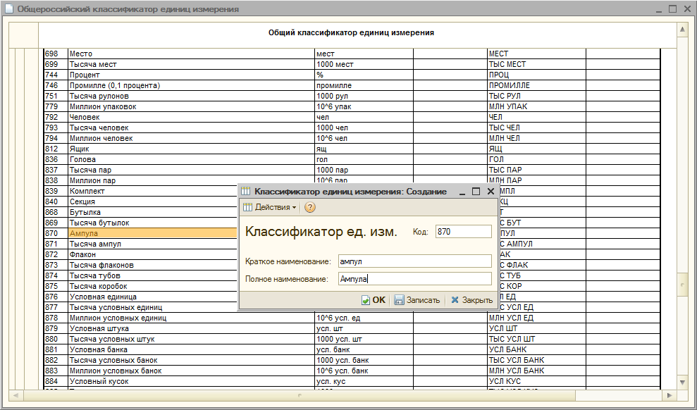 После нажатия на кнопку «ОК» выбранная единица измерения добавится в справочник «Классификатор единиц измерения».