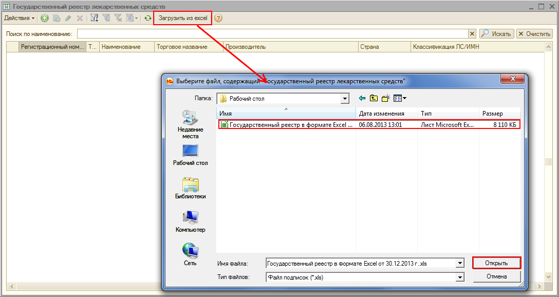 Для того, чтобы заполнить регистр, скачайте актуальный файл с сайта РГП «Национальный центр экспертизы лекарственных средств, изделий медицинского назначения и медицинской техники», воспользуйтесь командой «Загрузить из Excel», укажите путь к скачанному файлу и выберите команду «Открыть».