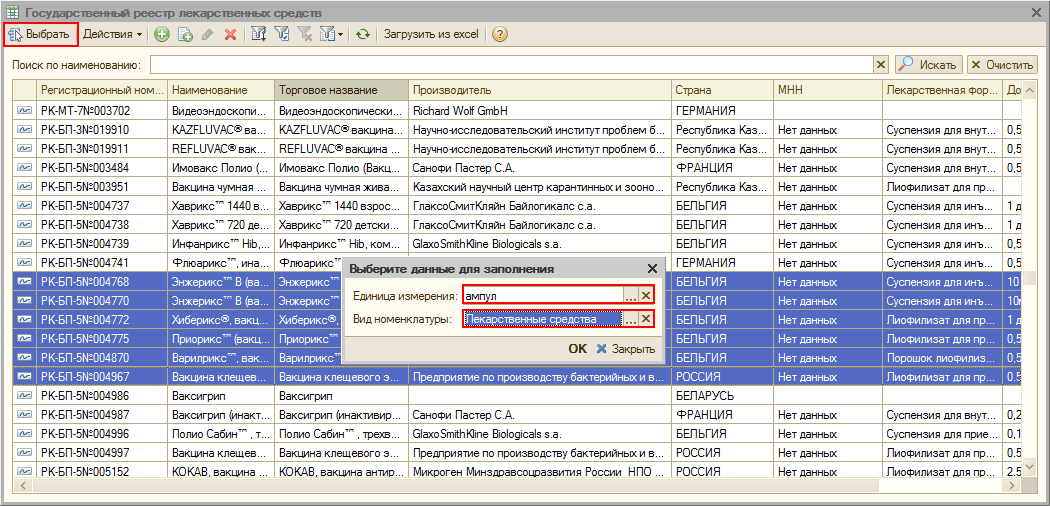 Из реестра выберите одну или несколько строк, используя клавиши Shift или Ctrl. Далее нажмите кнопку «Выбрать», появится диалоговое окно «Выберите данные для заполнения». В окне укажите для выбранных позиций единицу измерения и вид номенклатуры.