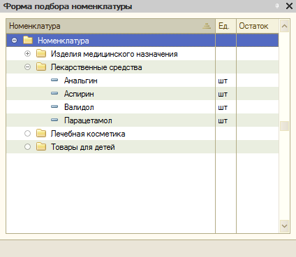Рассмотрим окно подбора при учете остатков в разрезе розничных цен. Окно подбора представляет собой иерархическую структуру справочника «Номенклатура». Для каждой позиции номенклатуры в форме подбора отображается дополнительная информация о единице измерения, в которой хранится номенклатура, и остатке данной номенклатуры на складе аптеки.