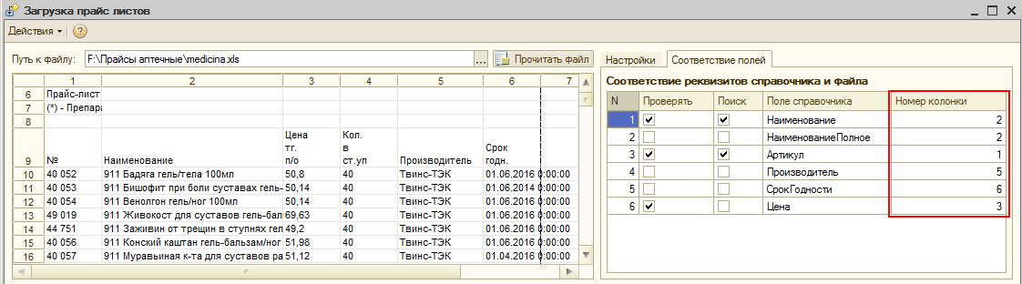 После того, как будут определены поля поиска, укажите номер колонки из загружаемого прайс-листа, в которой содержится значения для загрузки в информационную базу. Например, для поля «Наименование» и «Наименование полное» укажите номер колонки, в которой содержится название лекарственного средства, в поле «Цена» - номер колонки, содержащей цену лекарственного средства и т.д. Если прайс-лист не содержит информации, представленной в списке соответствия полей, например, поставляется без артикула, то колонка «Номер колонки» для поля «Артикул» не заполняется и остается пустой. Если прайс-лист содержит колонки, для которых в справочнике «Номенклатура поставщиков» не предусмотрены реквизиты, то такие колонки при загрузке игнорируются.